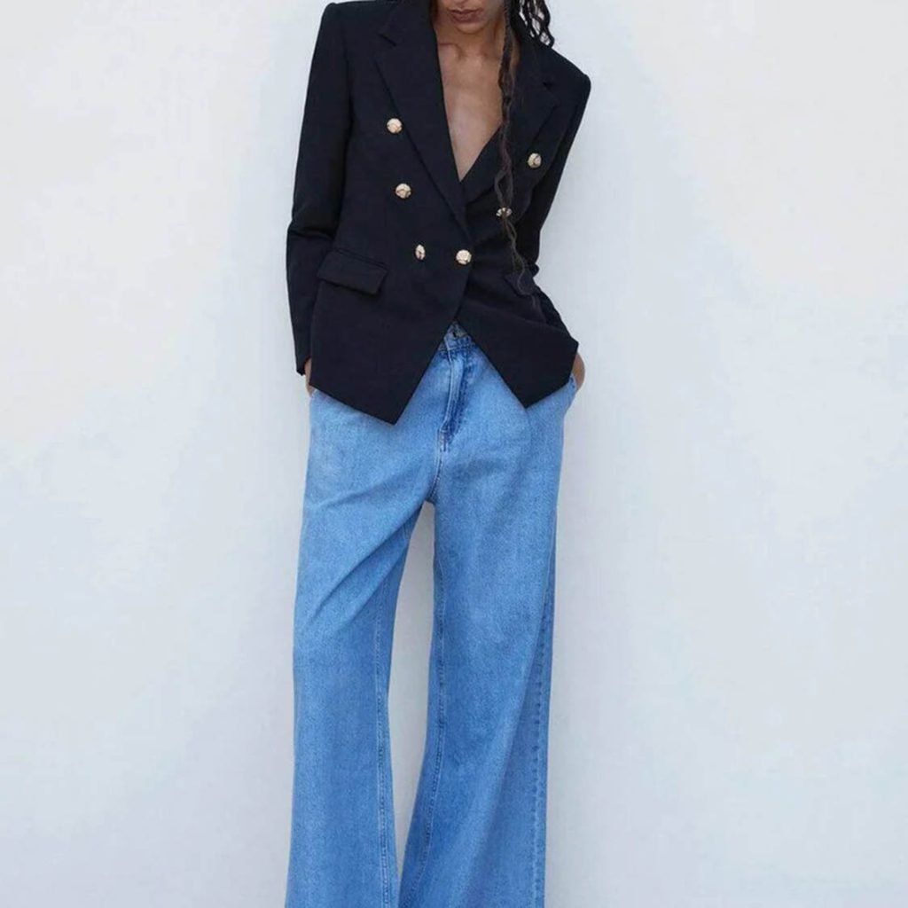 L’intégration du jean taille haute au travail est un atout majeur cette année. Optez pour une veste de costume courte et bien coupée pour un look formel sans être trop sérieux.